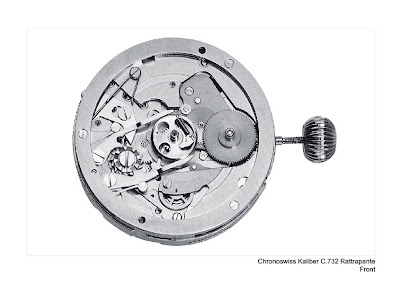 Die Arbeiten sind Kaliber C.732 mit automatischem Aufzug durch einen Skelettrotor und 25 Funktionsjuwelen. Der Chronograph kann Intervalle von bis zu 12 Stunden messen. Direkt unter dem Zifferblatt befindet sich der nach klassischen Prinzipien aufgebaute Split-Seconds-Mechanismus (Patent angemeldet) mit Ratschenrad und Zange. Ein weiterer Beweis für die Sorgfalt und Fantasie der Chronoswiss-Designer ist darin zu sehen, dass die Uhrwerke nicht größer als gewöhnlich trotz der Einbeziehung des komplexen zusätzlichen Mechanismus; Die außermittige Positionierung der Stunden- / Minutenanzeige in der Figur "3" ist eine elegante Lösung für dieses ästhetische Problem.